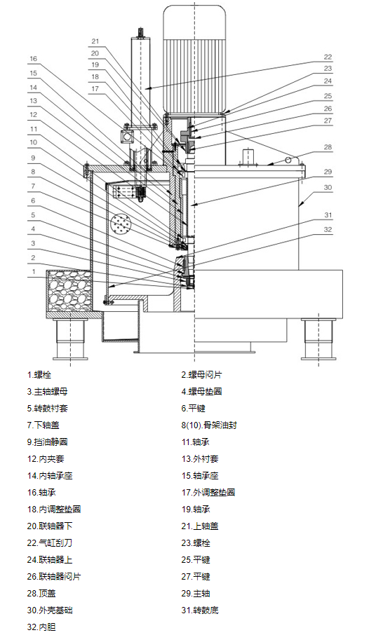 1、结构:外壳配置进料管、洗涤管、观察镜、排气口、检修孔、照明孔;密闭结构,转鼓及外壳、翻盖等部件为不锈钢材料(SUS304)制造。机座等为铸造件,表面包衬不锈钢。转鼓、外壳内外表面、机器外露件表面均抛光处理。